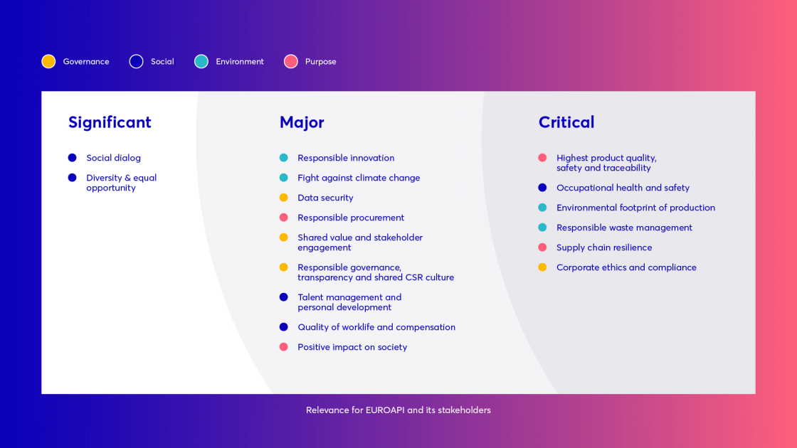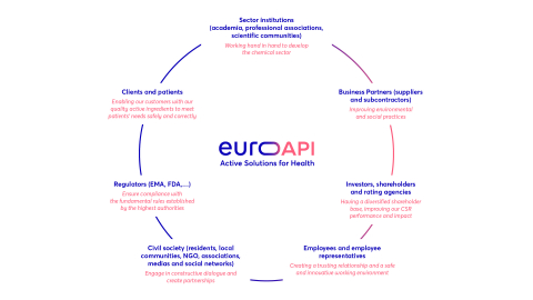 As a key player in the pharmaceutical value chain, EUROAPI's business activities impact a wide array of stakeholders. After setting out its business model, vision and mission, and identifying its stakeholders globally and at site level, it conducted a materiality analysis by consulting broadly with stakeholders. The materiality matrix then enabled the company to identify and prioritize expectations.