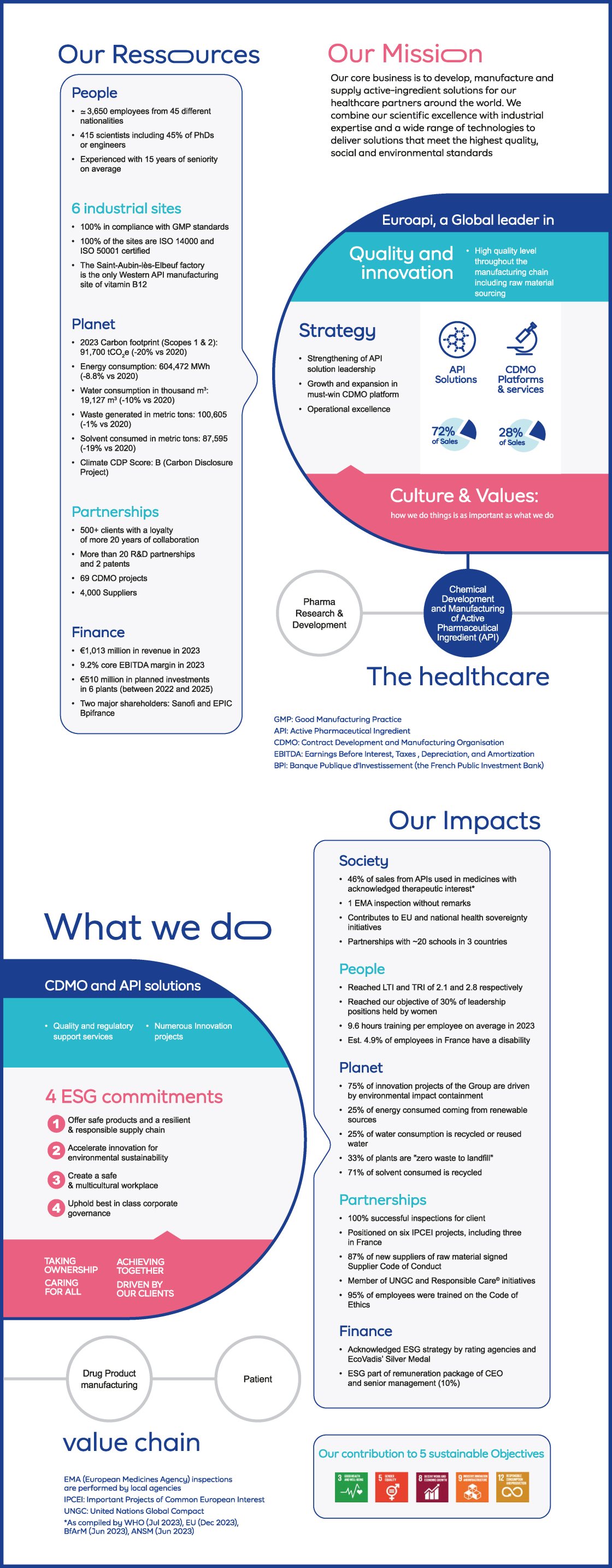 As a key player in the pharmaceutical medicine value chain, EUROAPIs’ business model illustrates the resources it is using, the added value provided by its technology and its know-how, as well as the impact of its business activities on society at large.